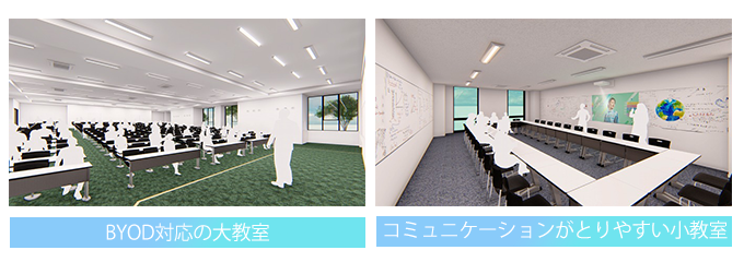 大教室2室、中教室14室、小教室32室を備えた新校舎。学生個人所有のデバイスを授業等で活用して、効率的な学修を促すBYOD(Bring Your Own Device)に対応するため、大教室には全席にコンセントを設置。コミュニケーションの活性化やアクティブラーニングなど多彩な学修スタイルに対応するため、中・小教室では机や椅子を可動式にし、実践的な学びを可能にする学修環境を整備します。