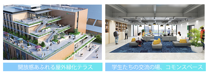 緑化された屋外テラスは、授業の前後などに学生が憩い、ふれあう新校舎のシンボル的スペース。休憩の他、グループワークやクラブ・サークル活動などに利用できるコモンスペースは、テラスに面したオープンタイプ、個室型のクローズドタイプを用意し、活発なコミュニケーションを促します。