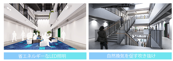 自然採光、空気の対流による自然換気を促す吹き抜け、LED照明、太陽光パネル、冷暖房効率を高める複層ガラスなどを採用し、環境負荷を低減。換気や省エネルギーへ配慮した設計により、SDGsやアフターコロナ時代に対応しています。