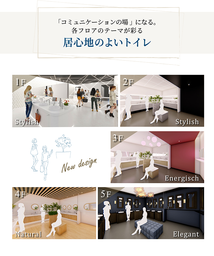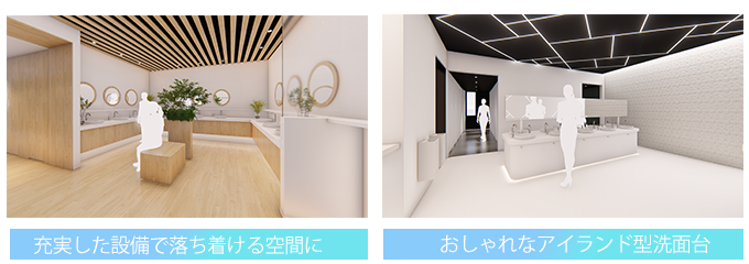 広々と清潔で明るいスペースに、スタイルミラーやコンセント付きカウンター、バッグを置けるベンチなど、ゆっくりメイク直しができるパウダーコーナーを設置。おしゃれなアイランド型の洗面カウンターも設けられ、機能性とデザイン性を兼ね備えた空間となっています。