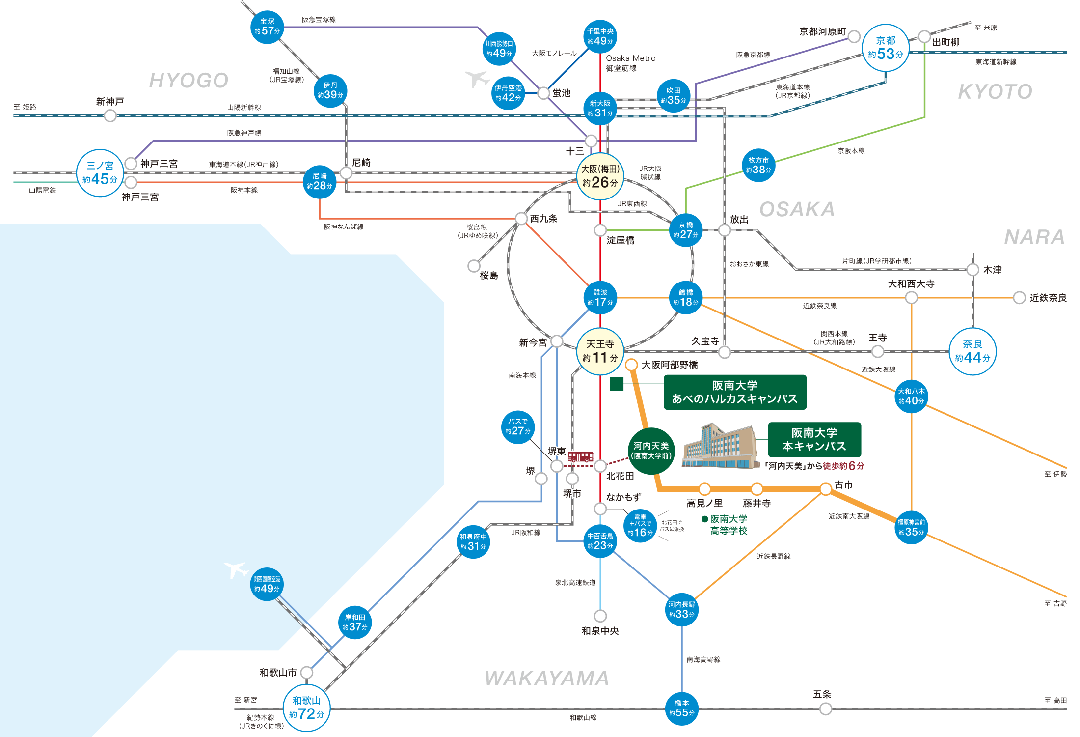 大阪南部の玄関口「天王寺・阿倍野エリア」から抜群のアクセスを誇る阪南大学本キャンパス。2024年4月に教室棟として阪南大学最大となる新校舎が誕生。アクティブラーニングや学生同士の交流を促進させる最新設備を整えた充実の学修環境で実践的に学びます。