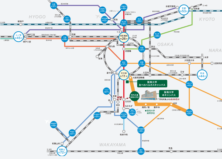 大阪府下の主要駅はもちろん、奈良や和歌山、尼崎、西宮方面からもアクセス抜群!