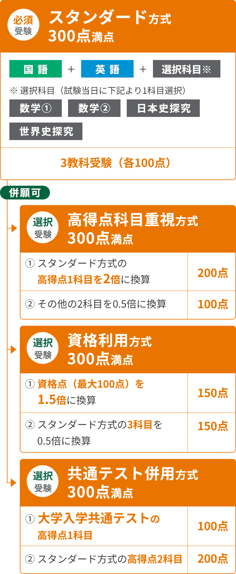 3教科(高得点2科目を各100点)+大学入学共通テスト(高得点1科目を100点換算)300点満点で選考