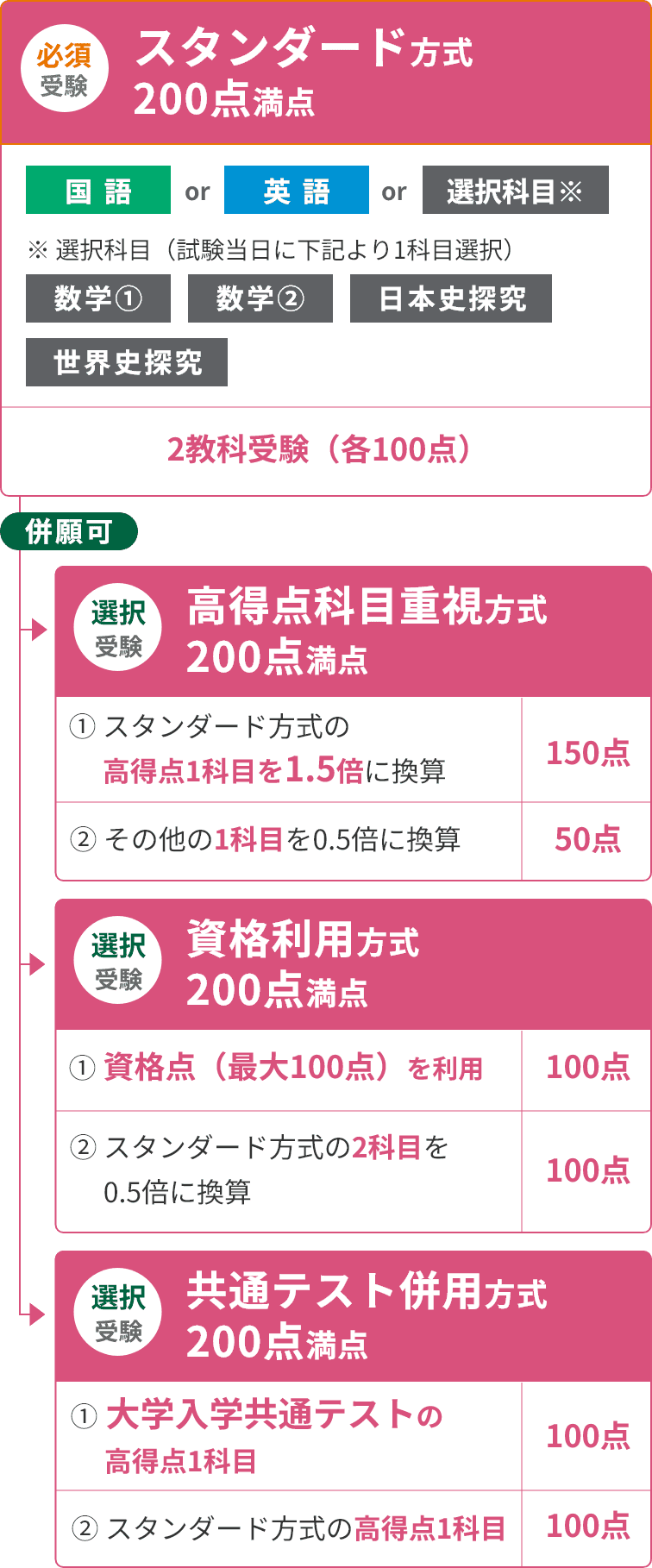 3教科(高得点1科目を200点換算・他の2科目を各50点換算)300点満点で選考