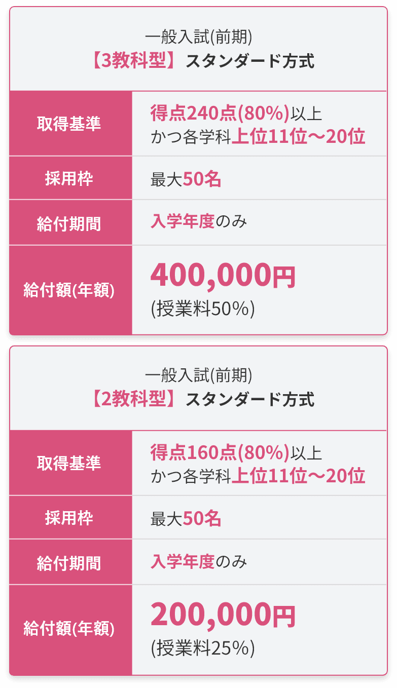 ※ 特待生奨学金の2年次以降の給付については学業成績および面談を基に毎年審査します。