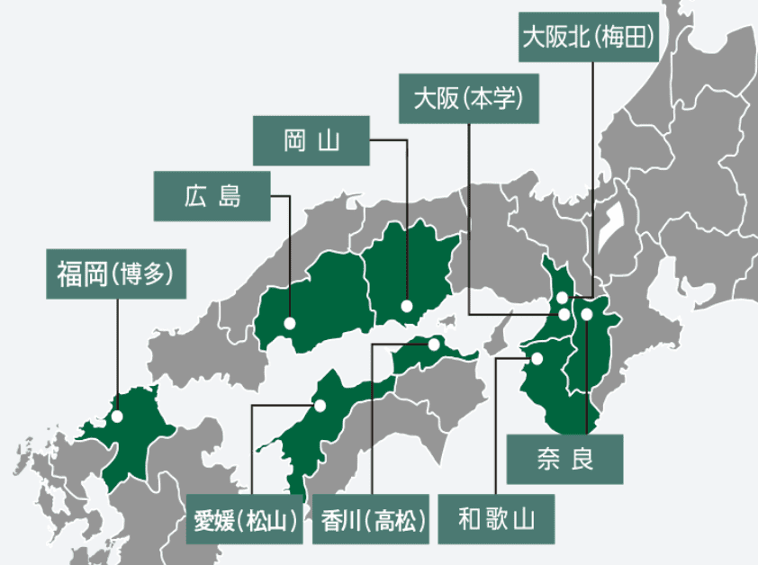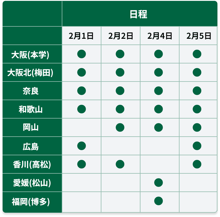一般入試(前期)では、本学(大阪)会場だけでなく西日本各地に試験会場を設けています。受験に係る経済的な負担を軽減させるとともに慣れ親しんだ土地で最大限の力を発揮して合格を掴みとってください。