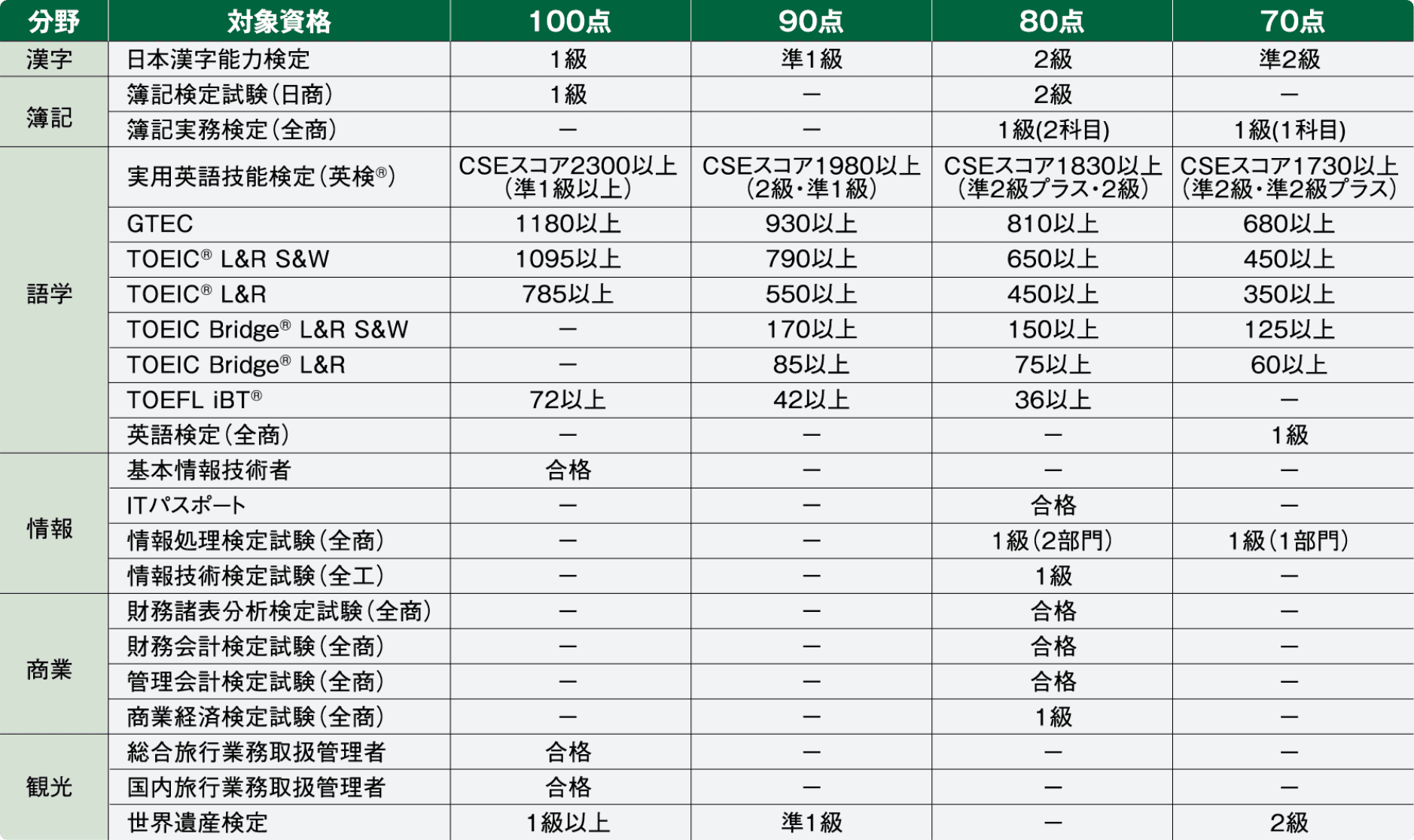 ※実用英語技能検定(英検®)は、合否に関わらず、指定された級を受験したCSEスコアで得点換算します。なお、合格証明書またはCSEスコア証明書に限ります。(個人成績表、合格証書は不可)