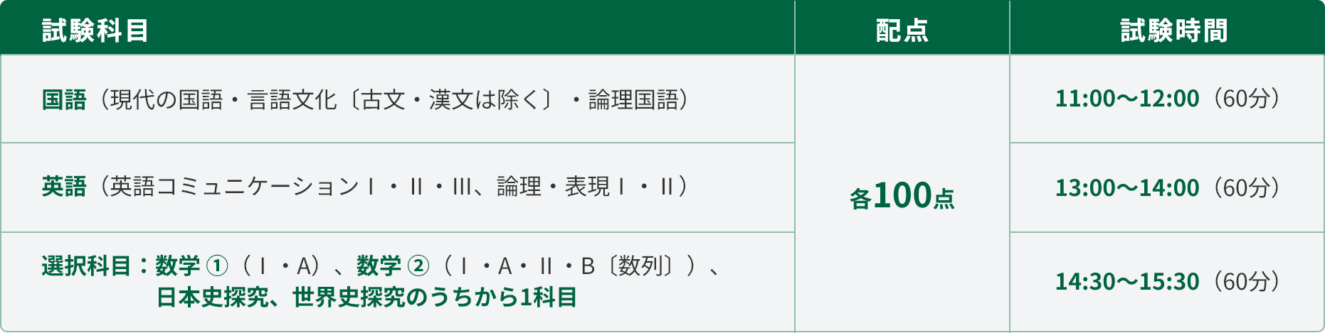 ※ 選択科目(数学①(Ⅰ・A)、数学②(Ⅰ・A・Ⅱ・B〔数列〕)、日本史探究、世界史探究)から2科目を選択することはできません。