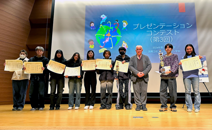2024年12月17日(火)国際コミュニケーション学科第3回プレゼンテーションコンテストを開催しました。今年、このコンテストは一年次生限定のイベントになりまして、7チームのプレゼンターズはSDGs17の目標を実現するための主張を、グローバル・ローカル・パーソナルの面から、独自の切口・実現の可能性・論理性・表現力について競い合いました。本学科の学生組織であるFISOと放送部の2名の部員は事前の準備及び当日の運営・司会を行いました。「大学入門ゼミb」の担当教員たちは各チームのプレゼンテーションを指導しました。