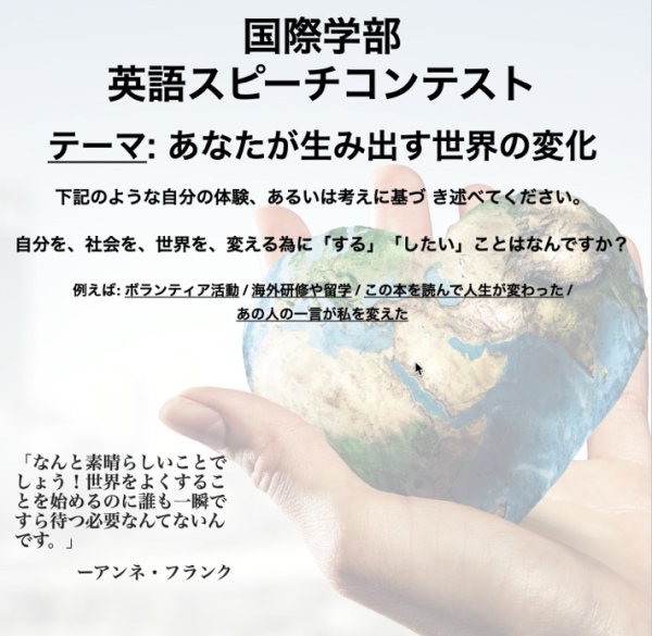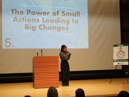 このスピーチコンテストは、英語で学生が皆に訴えかけたいメッセージや主張を伝え、その内容や表現力について競い合うものです。
