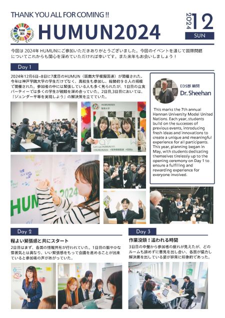 I am proud of all the students who took part in HUMUN 2024. This year featured new program elements, such as the inclusion of high school students as partcipants and innovative solutions created by the delegates under the theme of achieving gender equality and empowering women and girls (SDG #5). There were six meeting rooms, each led by skilled Room Chairs who managed discussions and ensured a smooth flow of debate. Students also worked diligently in planning teams, PR teams, and delegate support teams, showing outstanding teamwork and creativity. The delegates tackled complex global challenges with fresh perspectives and proposed forward-thinking solutions to advance gender equality. HUMUN 2024 provided students with a dynamic platform to learn, grow, and demonstrate their leadership skills.