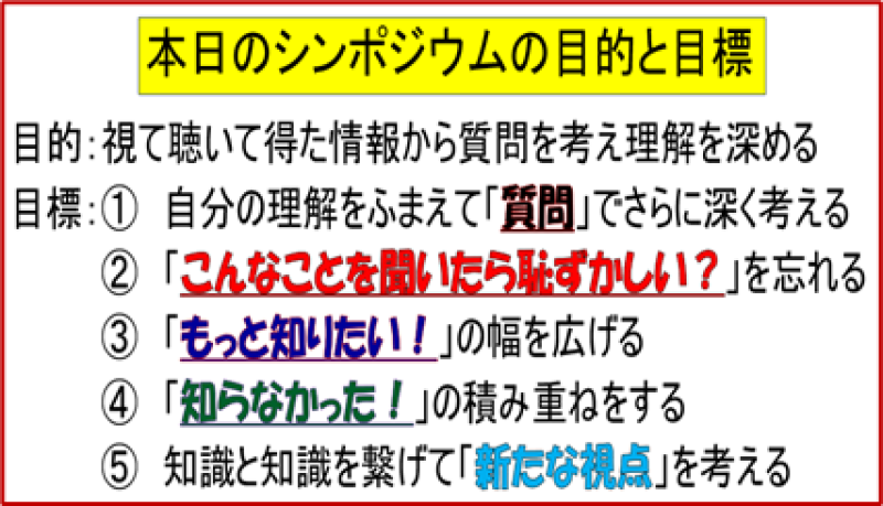 レポート提出の全学生からは、大変良問の質問を投げられました。そもそも、第2回のシンポジウムの目的と目標は下記に掲げるようなポイントとなります。