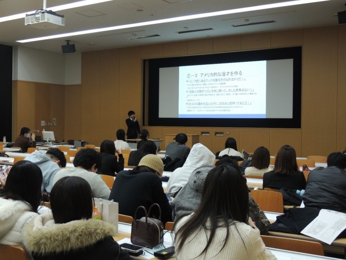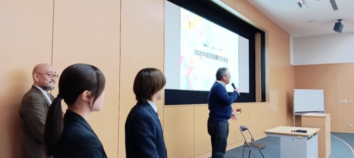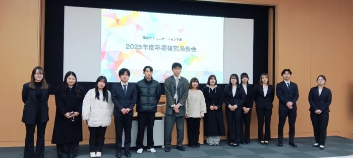 2026年1月20日(水)12時10分から15時10分まで、本学フロンティアホールにおいて、卒業研究発表会を開催しました。同発表会は2005年1月から毎年開催されています。今年度の発表会は合計9ゼミ・11組がこれまで重ねてきた研究の成果を披露しました。発表会は井上学科長の挨拶から始まり、進行方法に関する説明の後、各ゼミからの発表へと移りました。