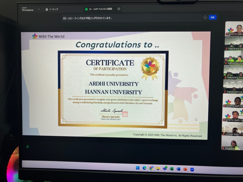 また、当日運用にあたってはWithTheWorldさんの杉田様らと大変多くの打ち合わせとメールのやり取りにて、詳細を詰めてまいりました。特にタンザニア側の通信トラブルやデモによる大学閉鎖問題等予期せぬ事態が次々と発生しましたが、その都度、本学eスポーツ学生チームとWithTheWorldさんとともに対応策を検討し、忍耐強く準備したことが成功につながったお思います。本学のeスポーツ学生チームとWithTheWorldさんの担当者様に大変感謝いたします。