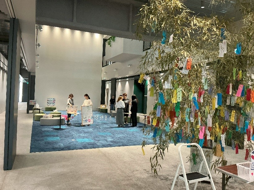 今年の七夕祭りは、昨年の反省を活かしながら企画を練り上げました。昨年は教室を会場としたため、外から様子が見えにくく、初めて訪れる学生にとってはやや入りづらい雰囲気がありました。そこで今年は、誰でも気軽に立ち寄れるよう、4号館1階の共有スペースを会場としました。開かれた空間にしたことで、通りがかった学生が自然に足を止め、また他学部の学生や先生方の目にも留まりやすくなり、来場者数の増加につながりました。