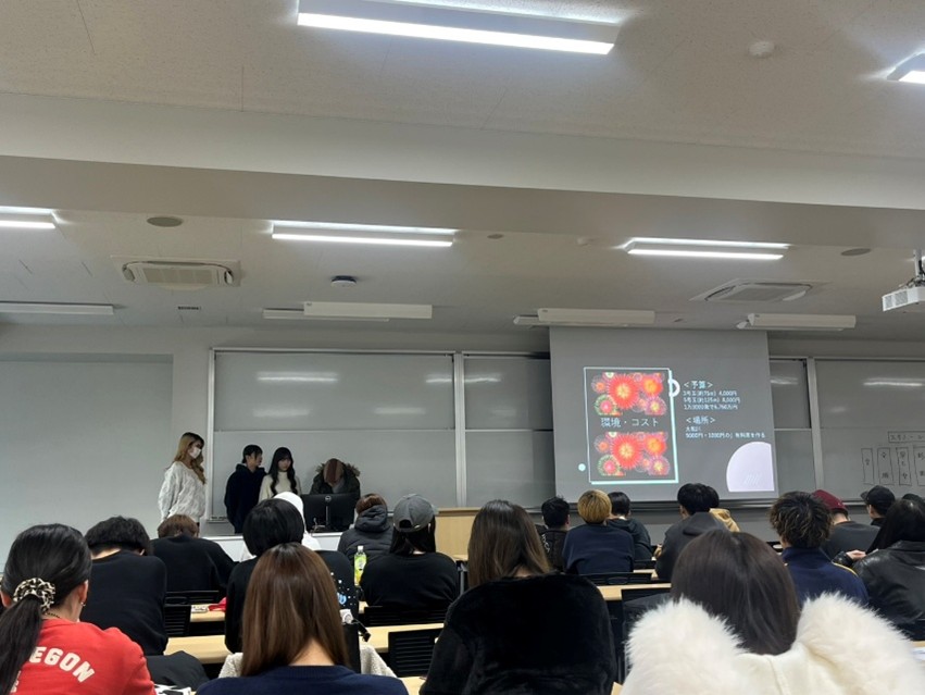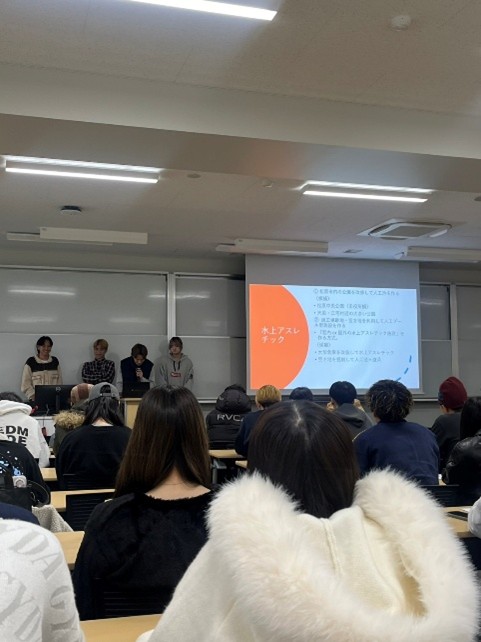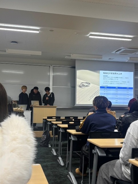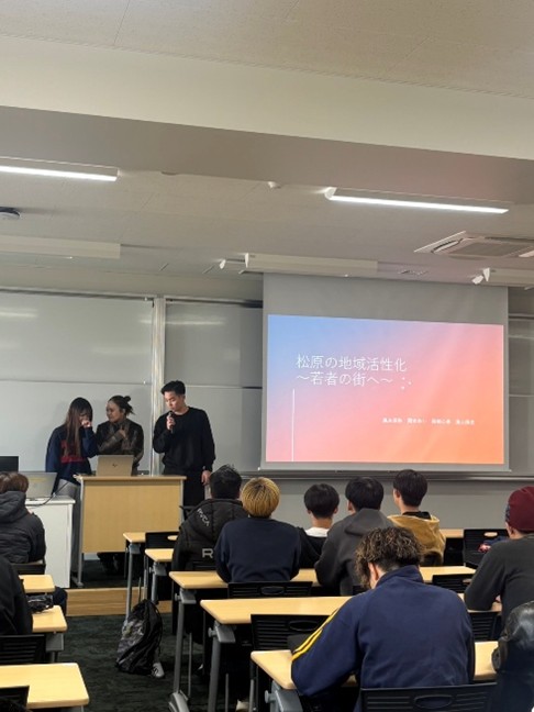 2025年12月1日のプレゼミでは、5つのプレゼミクラスによる合同発表会が行われました。「松原市が抱える社会課題を解決する提案」をテーマとする各クラスの代表チームのプレゼンに、一同、真剣に耳を傾けていました。