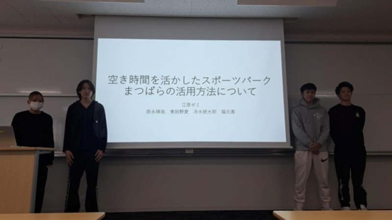 12月3日、水曜第2ブロックの5つのプレゼミ(江原・山内・新谷・李・村上)から代表チームが選ばれ、「スポーツパークまつばら」を運営するミズノスポーツサービス株式会社から提示されたテーマをもとに、合同プレゼンテーションを実施しました。各プレゼミには、①多目的人工芝(フットサルコート)活用事業、②スケボーのまちと地域連携、③スケボー普及活動(小学校)、④地域連携事業(阪南大学/セブンパーク天美など)、⑤学生が働きたいスポーツ施設、の5つのテーマが割り当てられました。