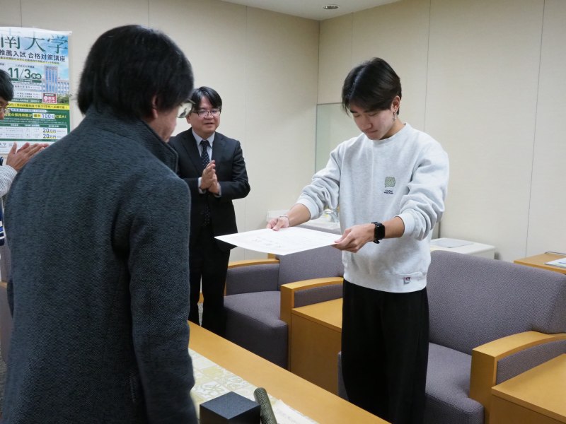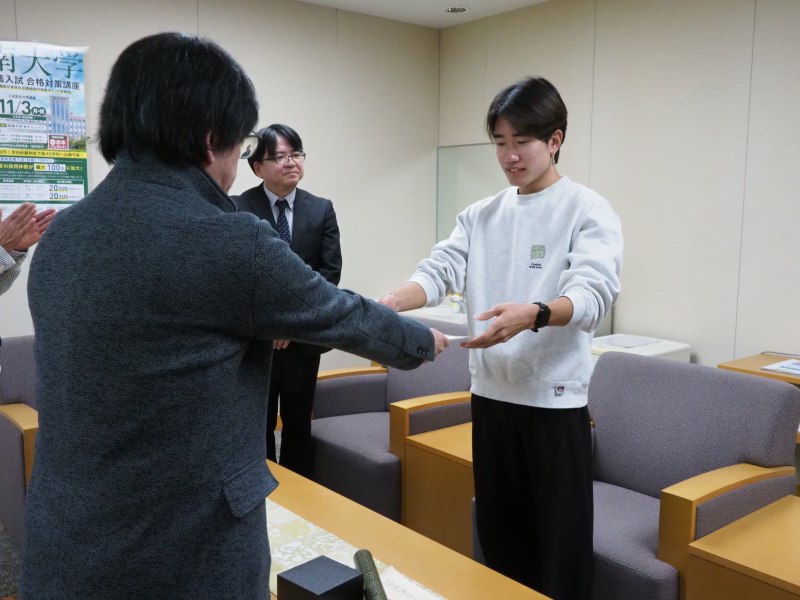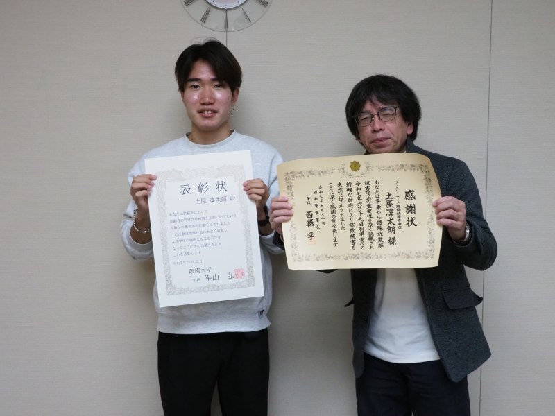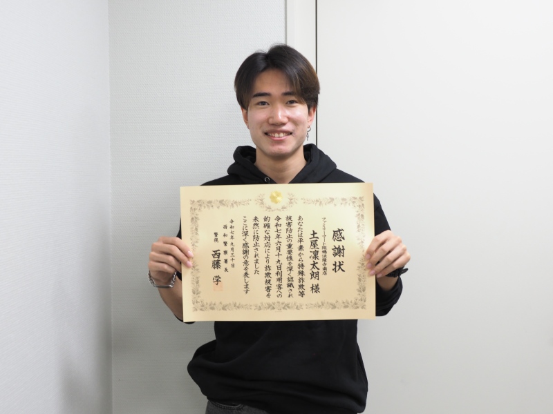 コンビニエンスストアでアルバイト中に特殊詐欺の被害を未然に防いだとして、経済学部経済学科2年の土屋 凜太朗さんが警察から表彰され、さらに本学からも学長表彰を受けました。