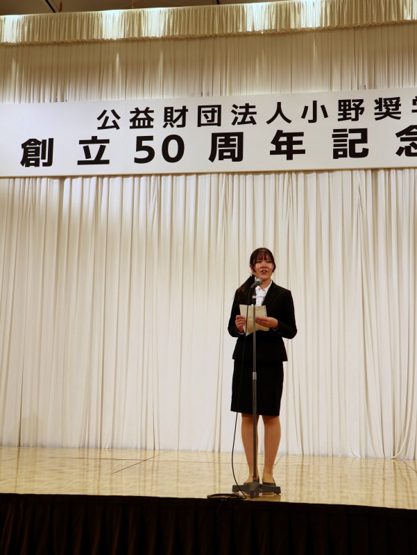 2025年9月、小野奨学会50周年を記念する式典が開催されました。その記念すべき場において、奨学生を代表し、冨里さんがスピーチを行いました。
