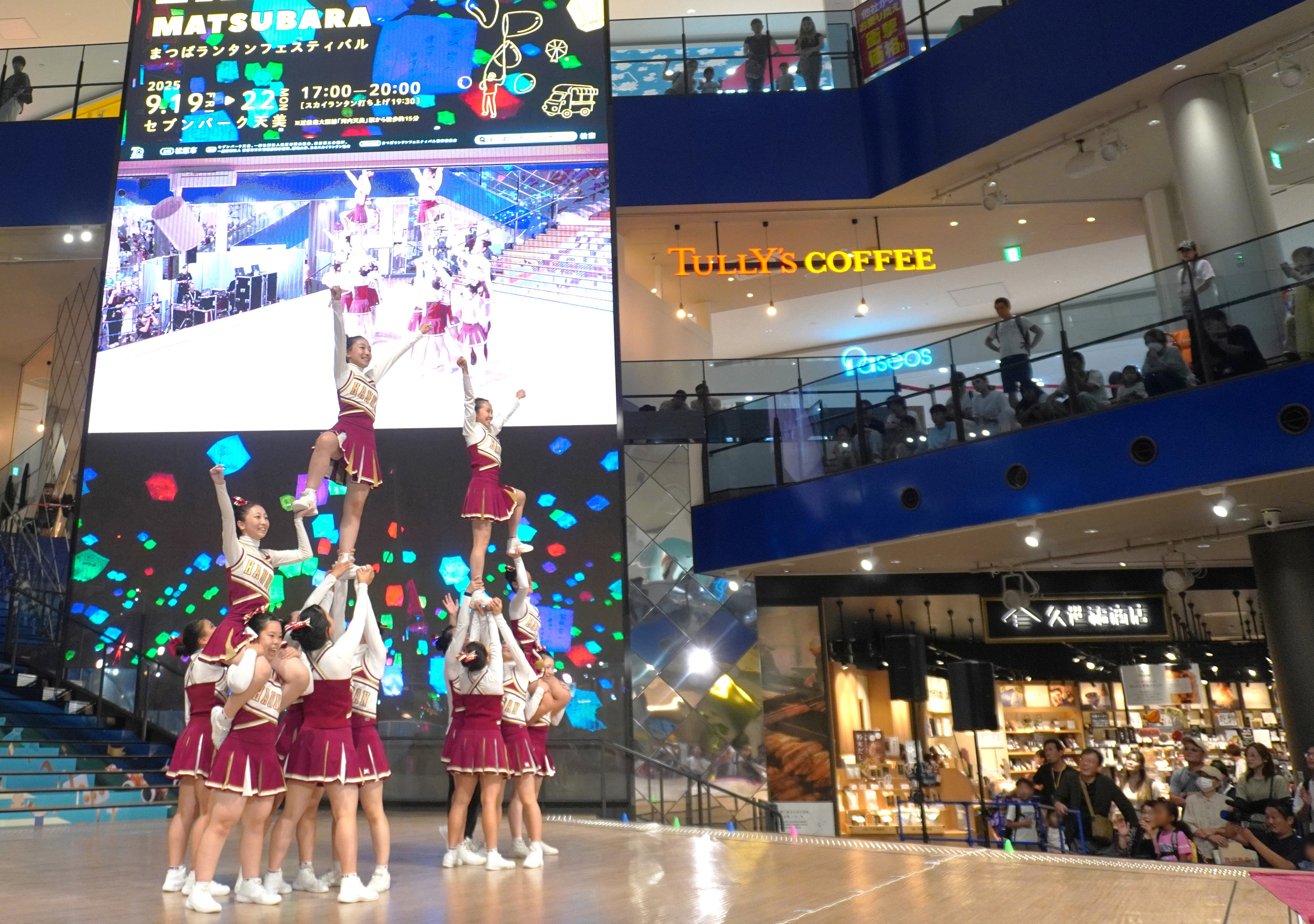 また、9月20日(土)には、まつばランタンフェスティバルのステージにおいて、本学チアリーディング部が出演し、迫力あるパフォーマンスで会場を沸かせ、温かいご声援を多数い頂きました。