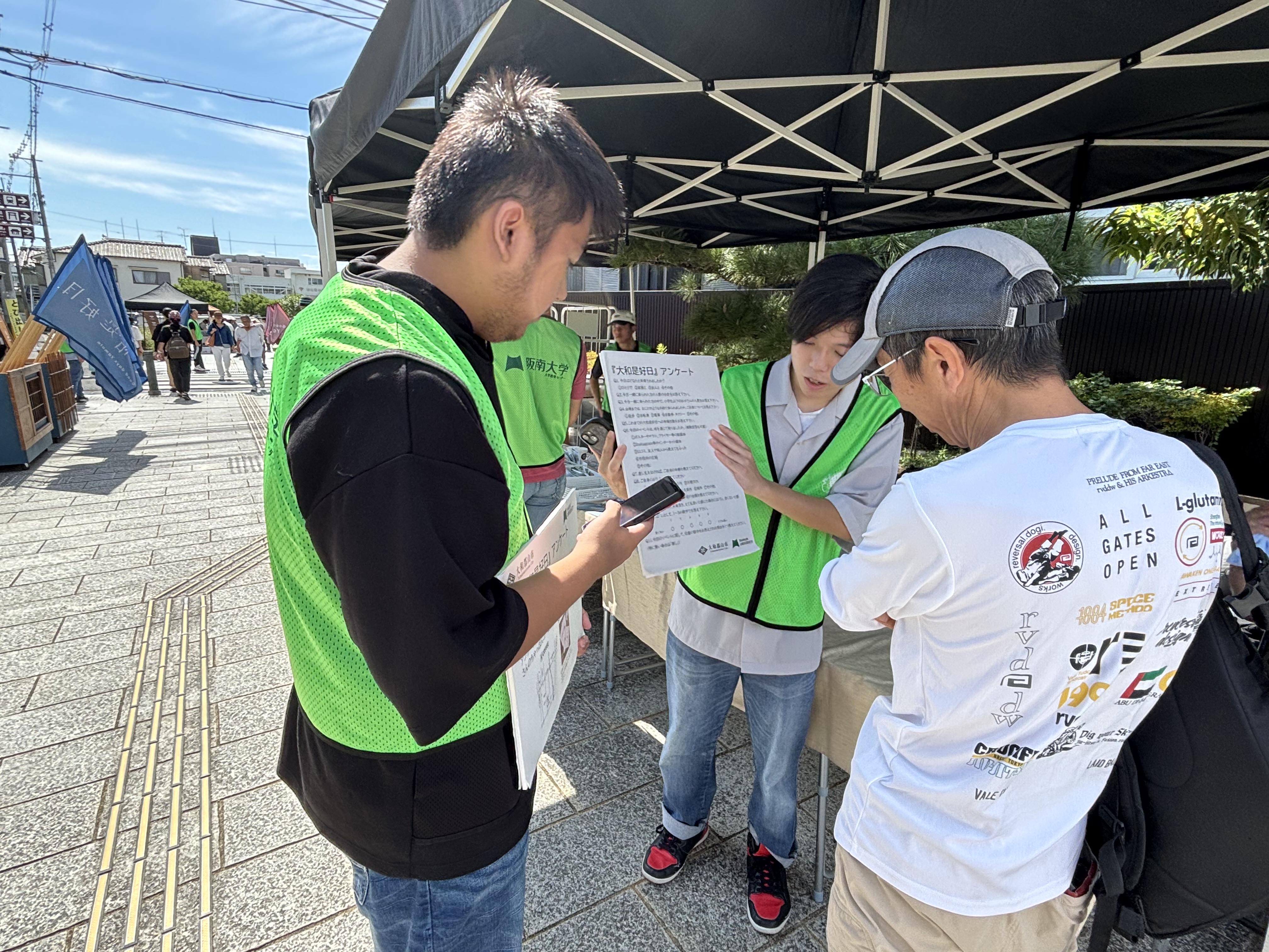 当日11時から16時にかけて、大和郡山市外堀緑地で開催された「大和是好日」において、本学の豆本ゼミ、髙橋ゼミ、櫻井ゼミの学生約58名が中心となり、来場者アンケート調査、通行量調査、本部運営を行いました。