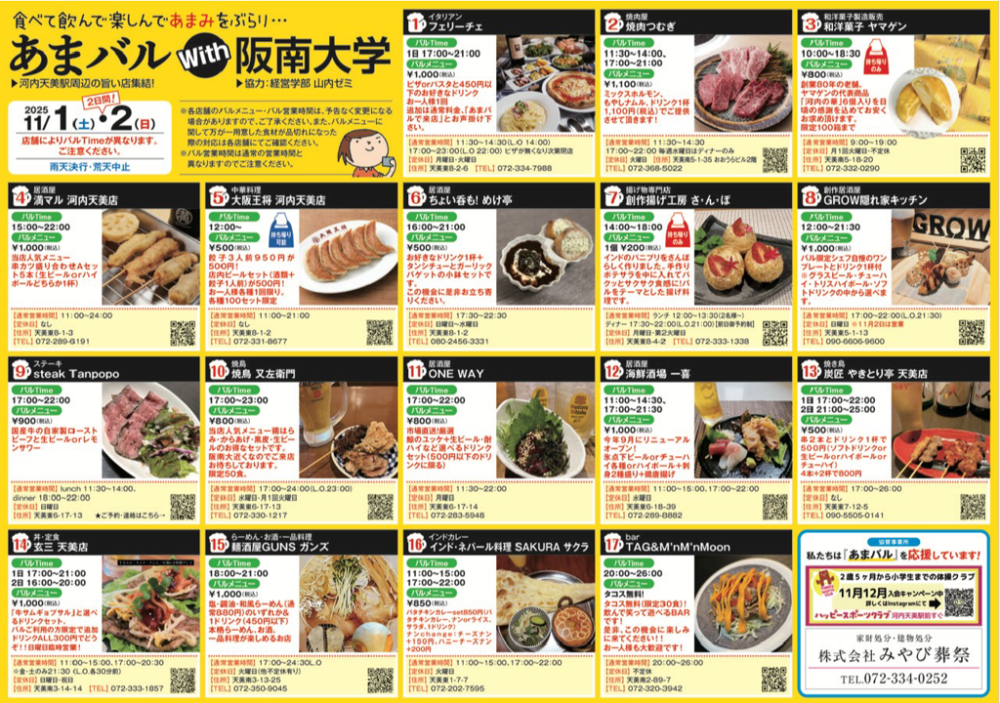 「あまバル」は、11月8,9日に開催される食の祭典「第16回まつばらマルシェ2025」の協賛イベントとして、河内天美地区のにぎわい創出を目的に開催され、地元の味自慢の17店舗が参加。経営学部の山内ゼミが、お店やメニューの魅力を取材し、情報発信する等、事業実施に協力します。