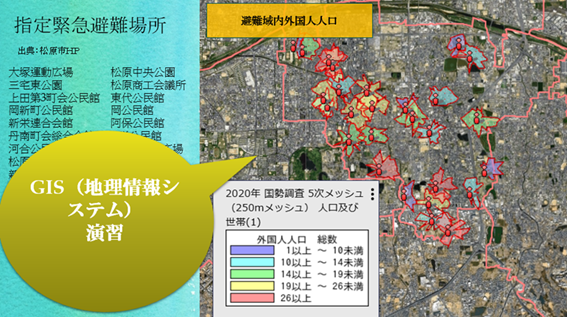 演習では、松原市に在る避難場所を地図上で確認し、その周辺にどれくらい外国人住民が暮らしているのかを可視化してもらいました。地図上に重ねて見ることで、どの地域に言語面での配慮が求められるかなど、リアルな防災イメージに繋げる機会となって頂ければ幸いです。