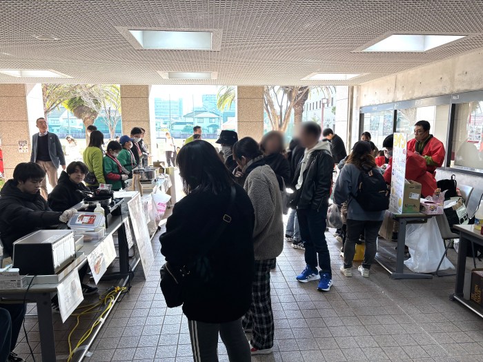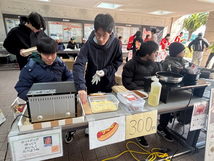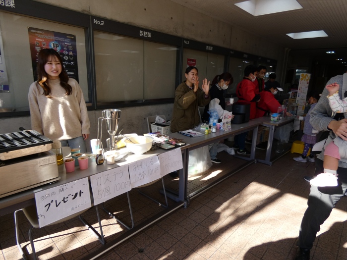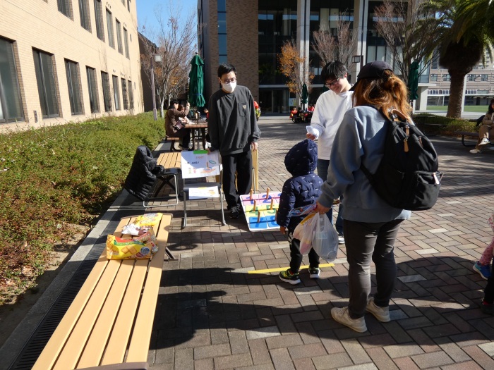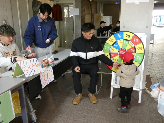 快晴に恵まれた当日は、本学8号館1階ピロティが昔ながらの縁日の賑わいに包まれ、わたあめ、ポップコーン、ベビーカステラ、ホットドッグ、おでん、焼き鳥、たこ焼きの屋台には行列ができるほどの盛況ぶりでした。また、ストライクアウト、射的、スーパーボールすくい、輪投げ、おもちゃ釣りといった遊びのコーナーでは、学生が工夫を凝らした運営により、子供たちが楽しめる空間が広がりました。