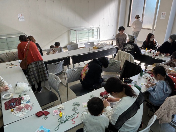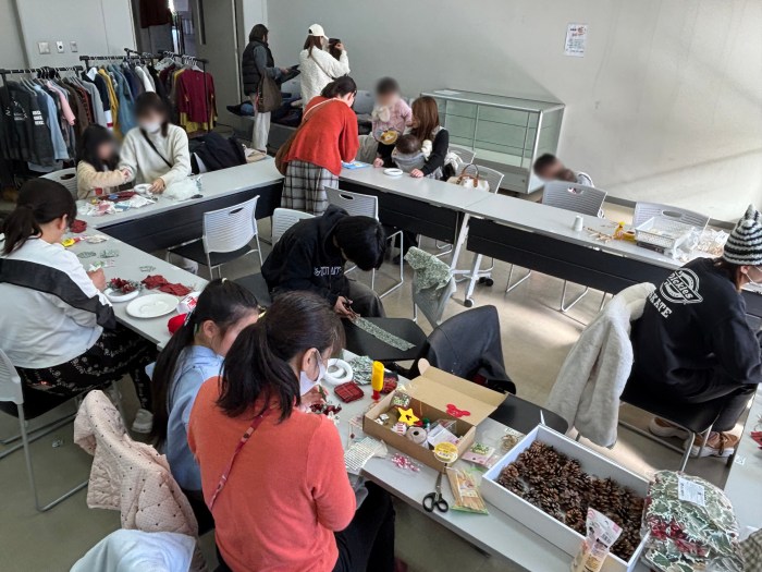 今回は、定藤ゼミが季節感あふれるクリスマスリースづくりを企画し、参加者は多彩な布の端切れを選んでデザインを工夫し、思い思いのリースを完成させました。親子連れの参加も多く、身近な素材を活かした創作の楽しさを味わうひとときとなりました。また、中西ゼミは地域内での衣類循環を目指して古着の無料提供ブースを設け、資源の有効活用の取り組みが行われました。今回も、地域での交流を広げるとともに社会課題の解決に寄与する、地域と大学が連携したイベントとなりました。