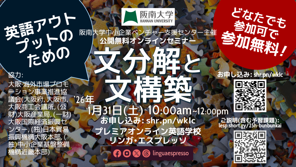多くの英語学習者が直面する課題である英語のアウトプット能力の向上について、「ともかく喋れば」、「ともかく音読すれば」などといった対策では問題の解決にはなかなか至らないのが実情です。実際にはしかるべき手順を踏めば能力を着実に伸ばしていくことが可能です。「仕事上どうしても英語を身につけなければならない・身につけたいけれど、なかなか上達しなくて困っている」という方を対象に阪南大学中小企業ベンチャー支援センターでは、2026年1月31日(土)の午前10時より、オンラインにて、グローバルビジネス研究会「初中級者向けの効率の良い英語学習法<第1 回>英語アウトプットのための文分解と文構築」を開催することとなりました。