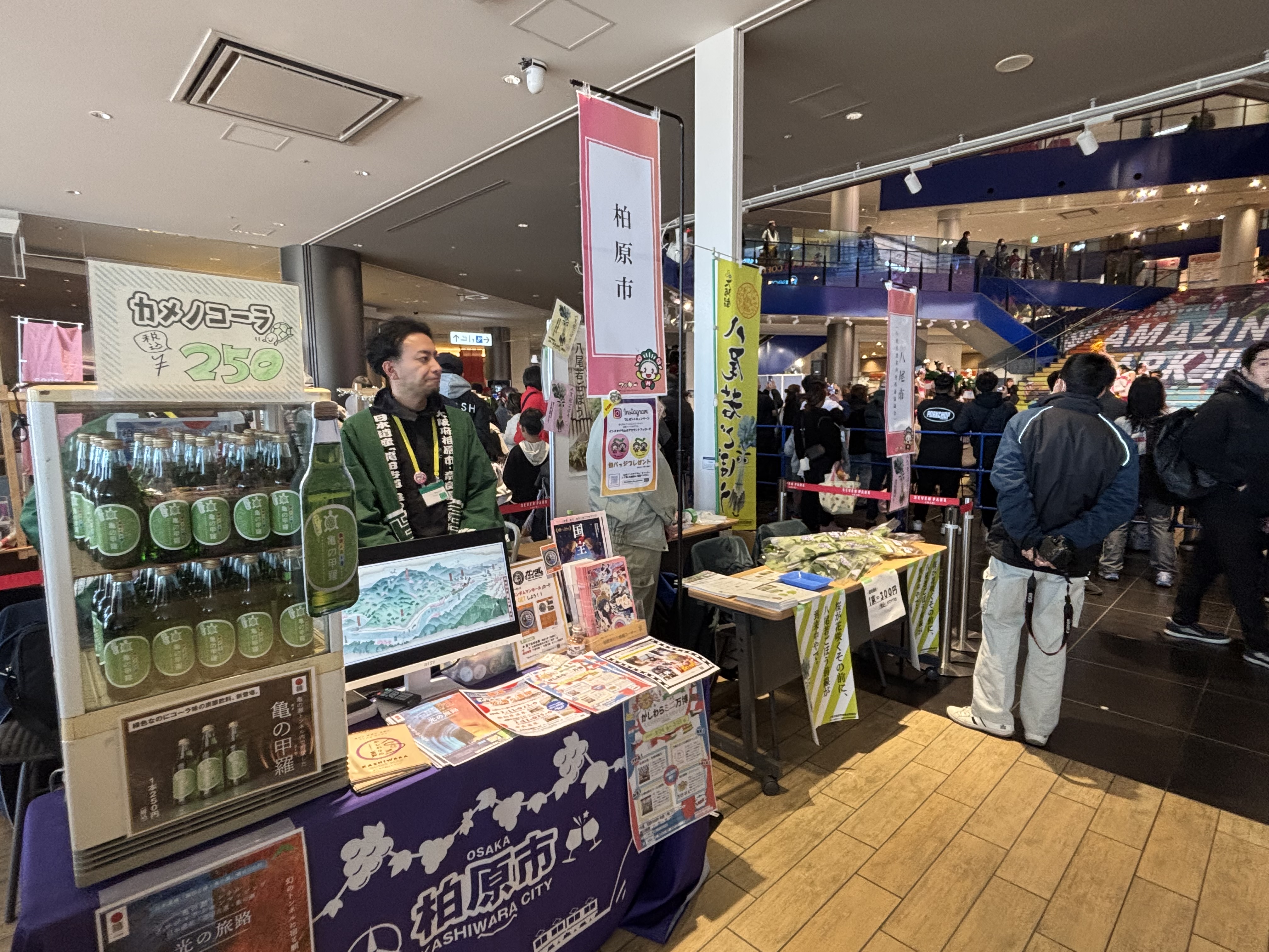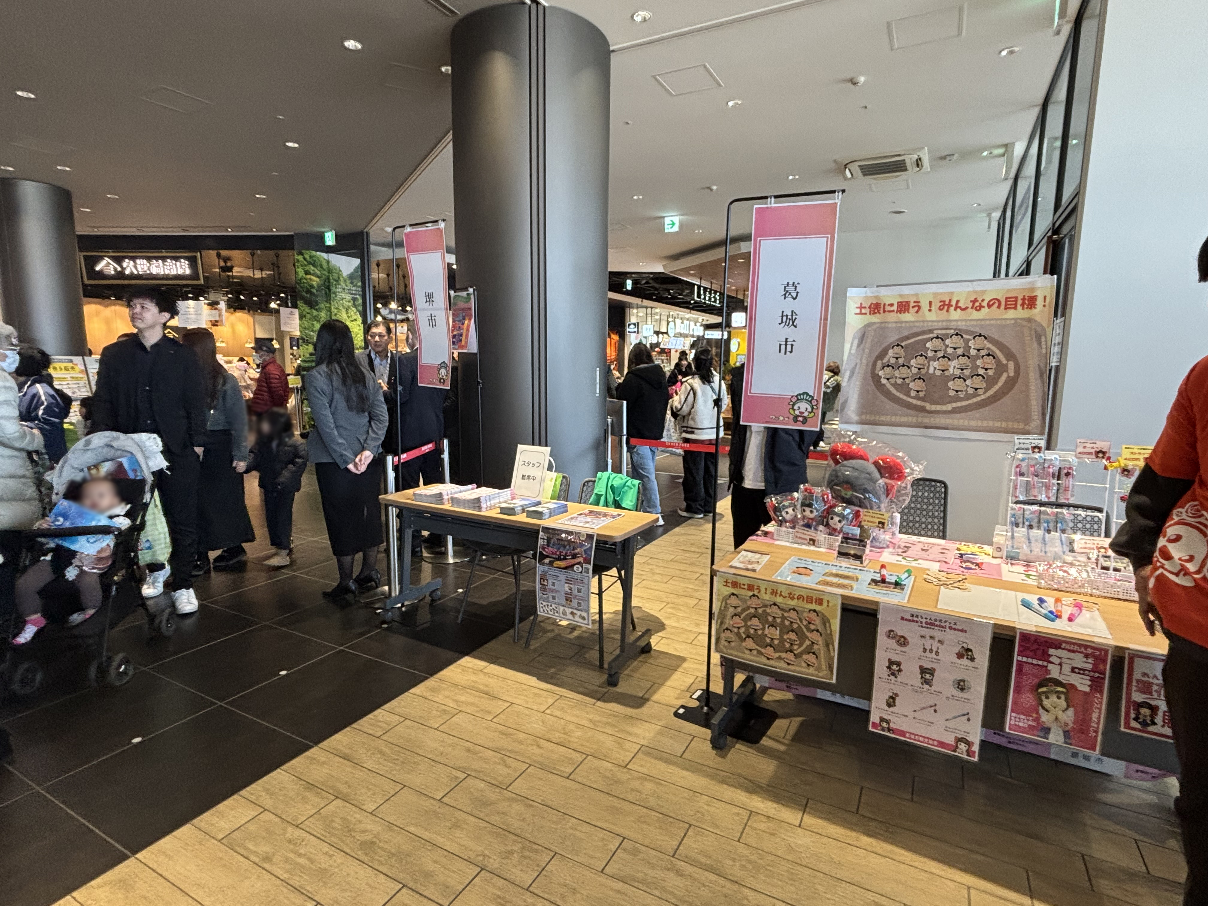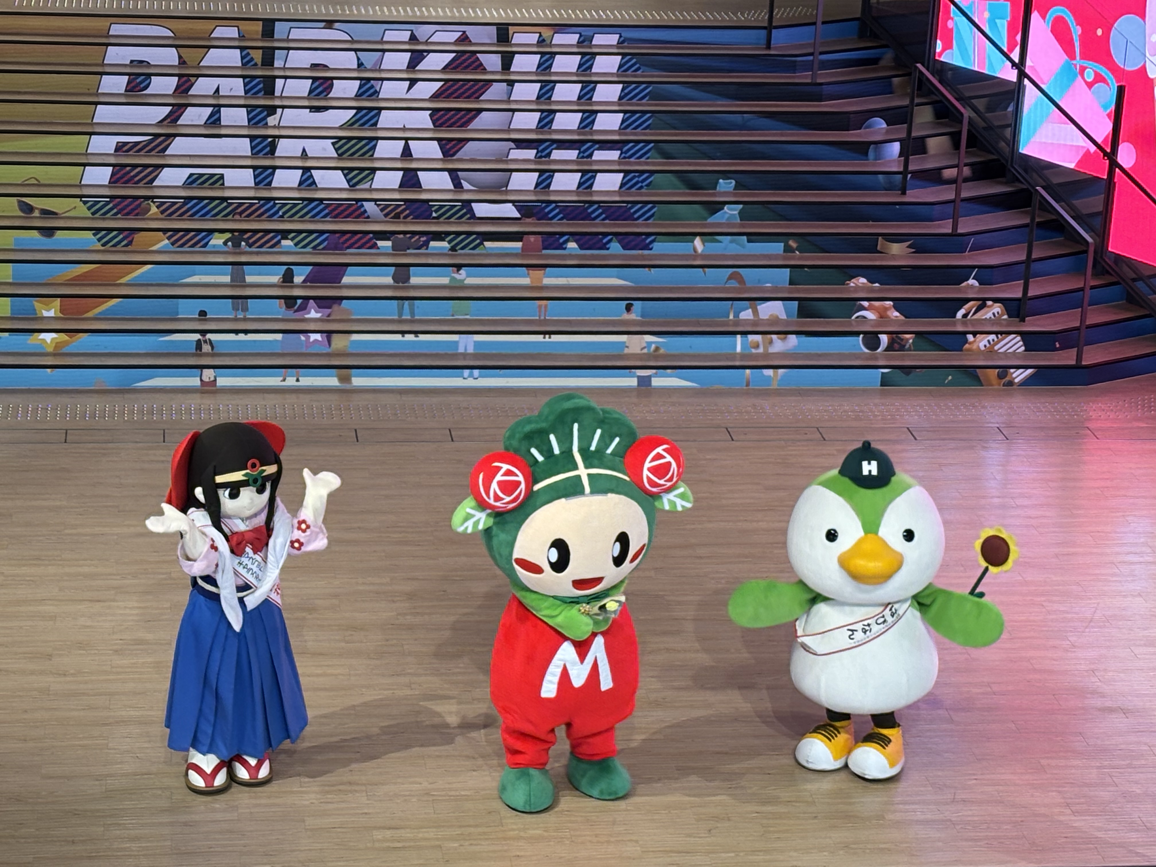 本学からはマスコットキャラクター「はぴなん」が登場し、マッキーとともにバースデーセレモニーや屋外で来場者の方と交流し、写真撮影や声援に応えながら、イベントの雰囲気を盛り上げました。