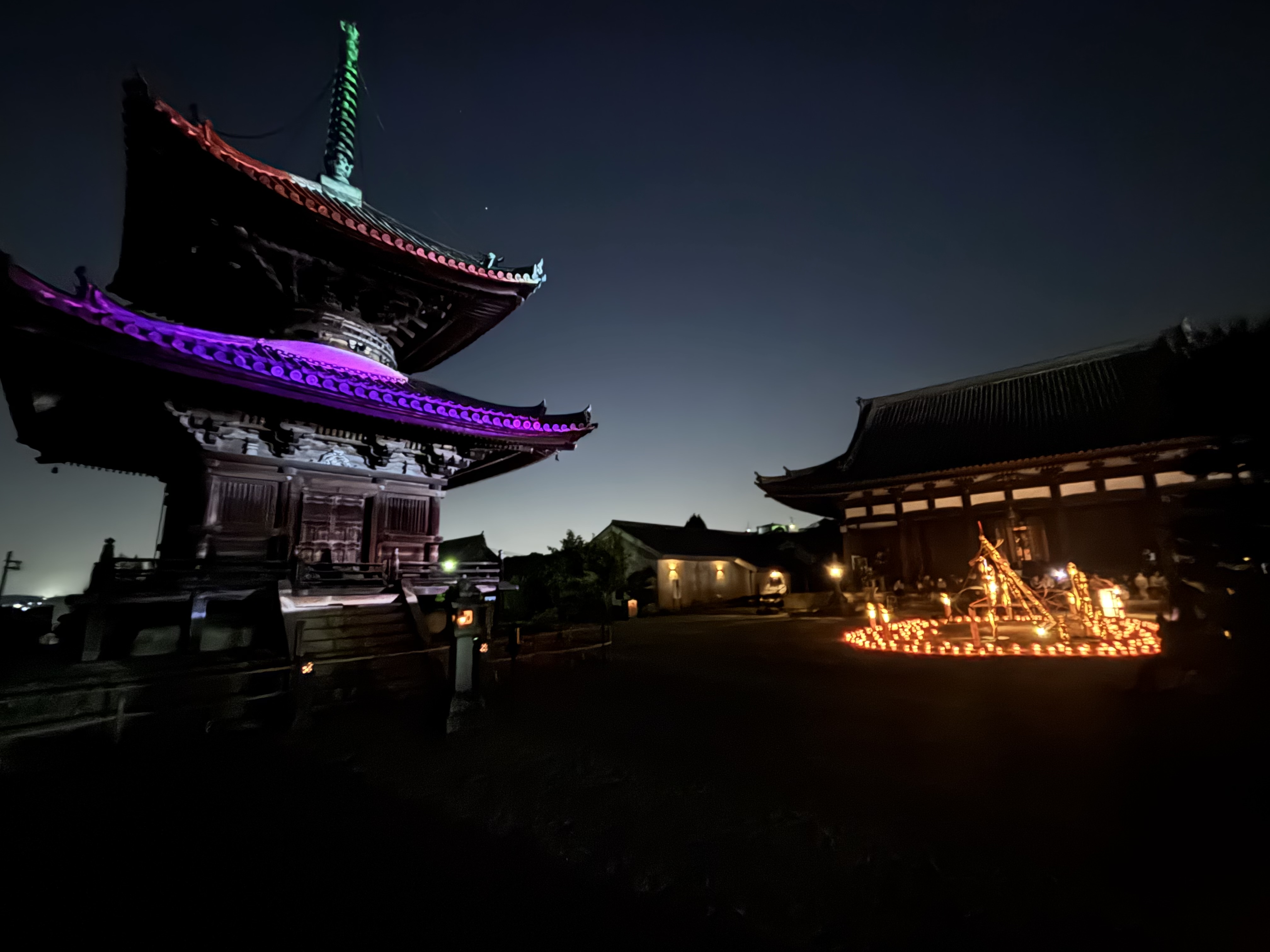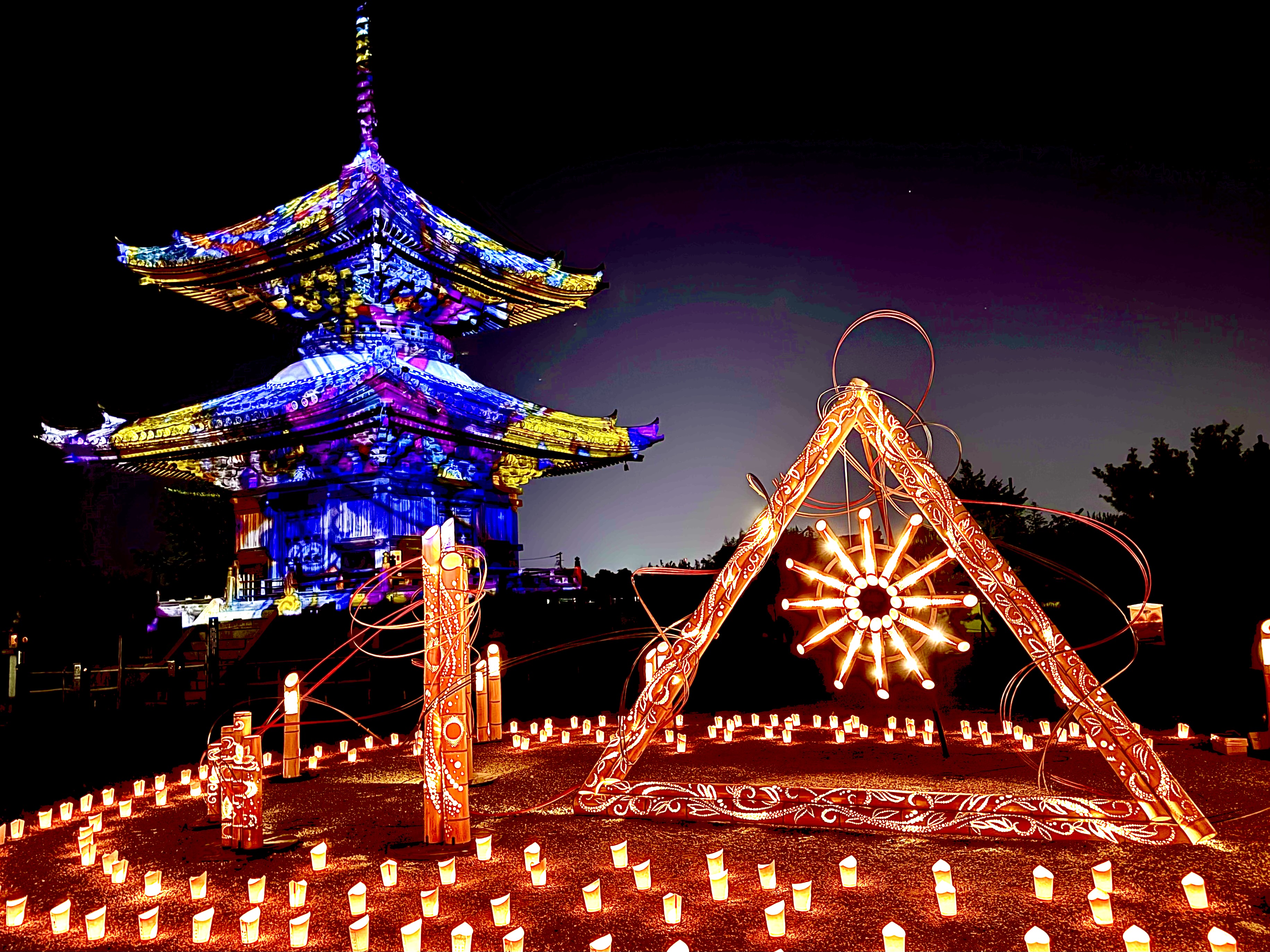太子聖燈会(たいししょうとうえ)は、聖徳太子の「和」の精神を尊び、太子町の魅力発信とまちの活性化を目的に開催されているイベントで、聖徳太子が眠る地を多くの灯りが幻想的に彩ります。今年は太子町町制施行70周年記念事業として実施され、赤井ゼミでは聖徳太子を題材にした映像に加え、太子町70周年にちなんだ新規映像も制作しました。また、阪南大学のマスコットキャラクター 「はぴなん」 も登場し、記念の年を華やかに盛り上げます。当日は、赤井教授とゼミ学生が企画、制作したプロジェクションマッピングを、叡福寺境内にある宝塔に投影します。