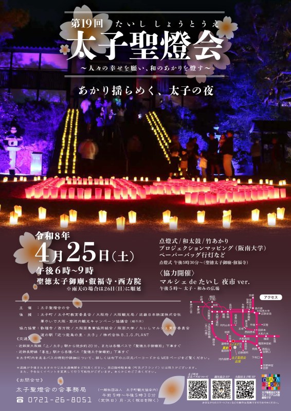 大阪府太子町との包括連携協定に基づく事業として、太子町のイベント「第19回太子聖燈会」において、総合情報学部赤井教授とゼミ学生によるプロジェクションマッピングが、4月25日(土)18時~21時に聖徳太子の御廟のある叡福寺で実施されます。