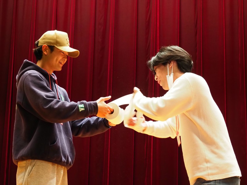 午後の部では、吉本新喜劇から吉田裕さんをはじめとする新喜劇座員の方々をお招きし、吉本ミニ新喜劇を開催しました。会場は終始笑いに包まれ、大きな盛り上がりを見せました。さらにレクリエーションも行われ、新入生同士の交流が深まる時間となりました。